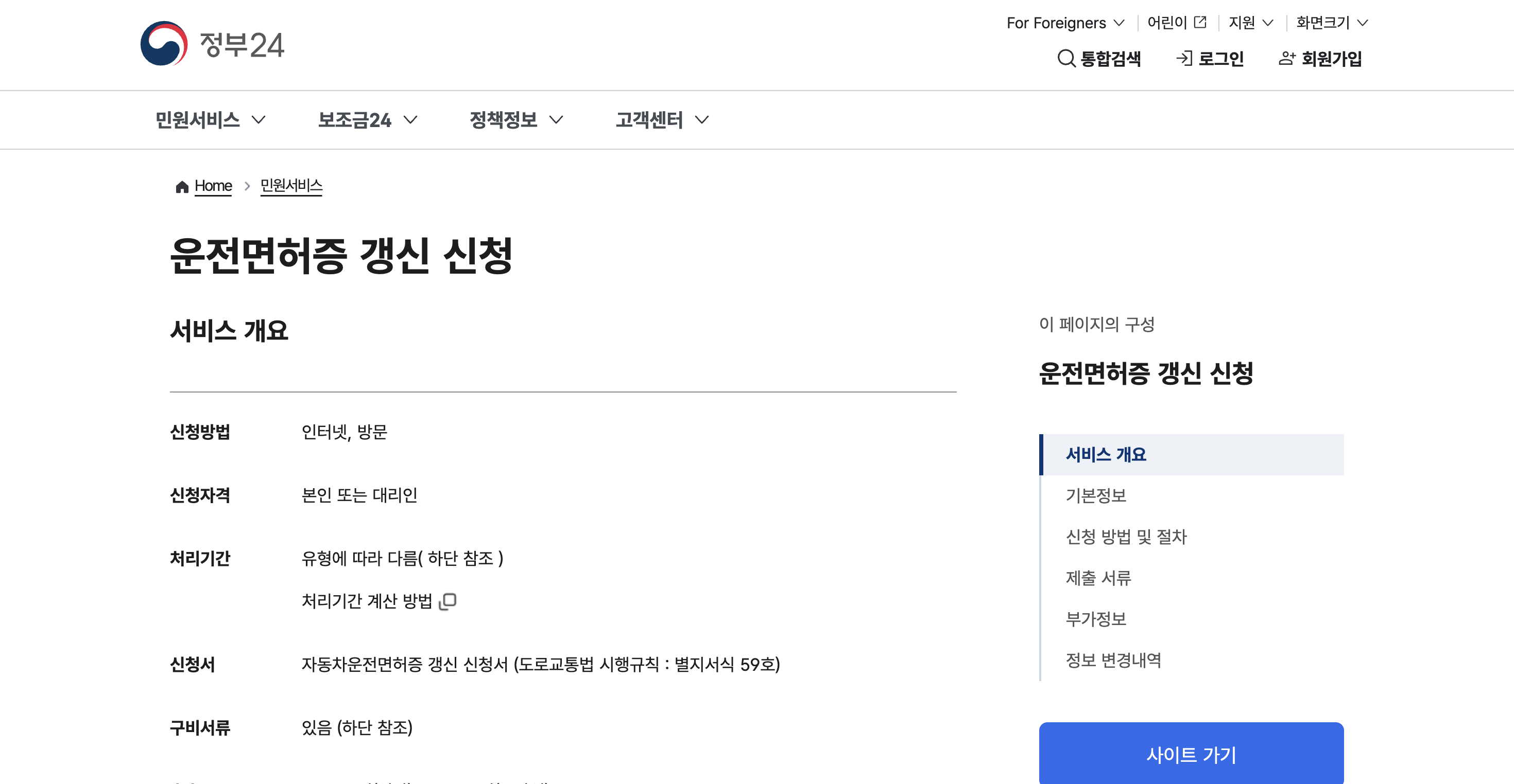 정부24: ‘운전면허 갱신’ 검색 후 가까운 기관 안내 확인